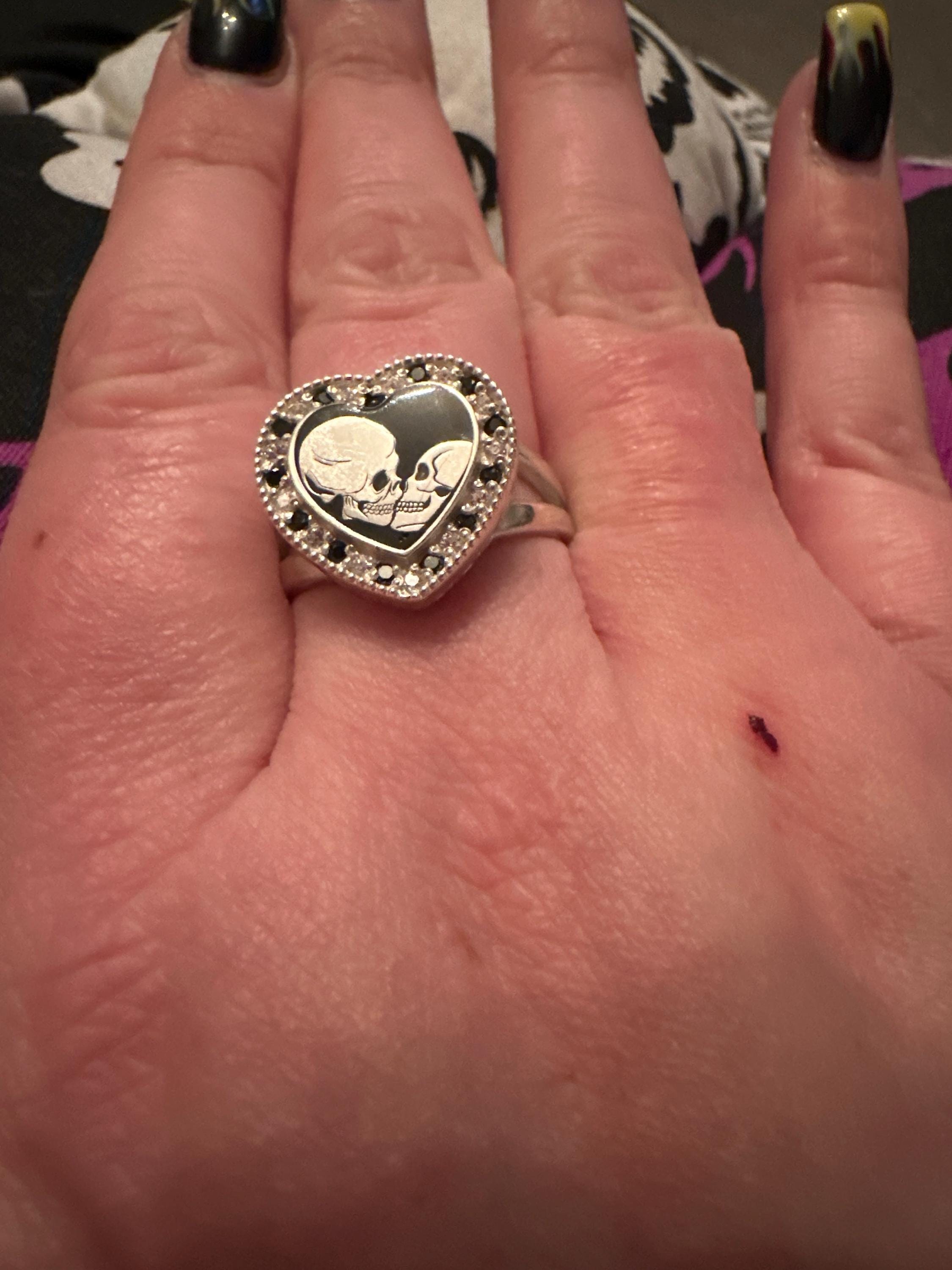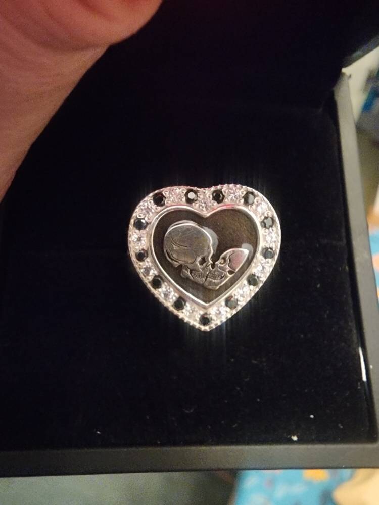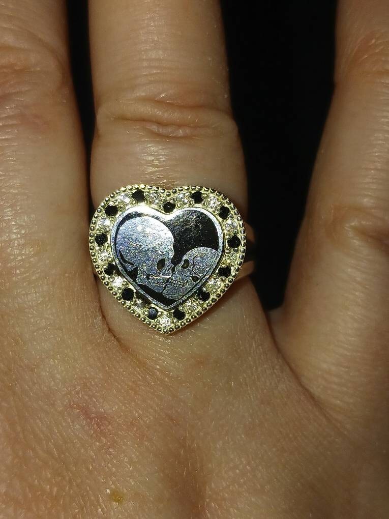Celebrate eternal devotion with a dark twist. This Gothic Heart-Shaped Ring features an engraved pair of skulls locked in a timeless kiss—framed by sparkling black and white stones. Designed for lovers who cherish bold symbolism, edgy style, and everlasting romance with an unconventional flair.
