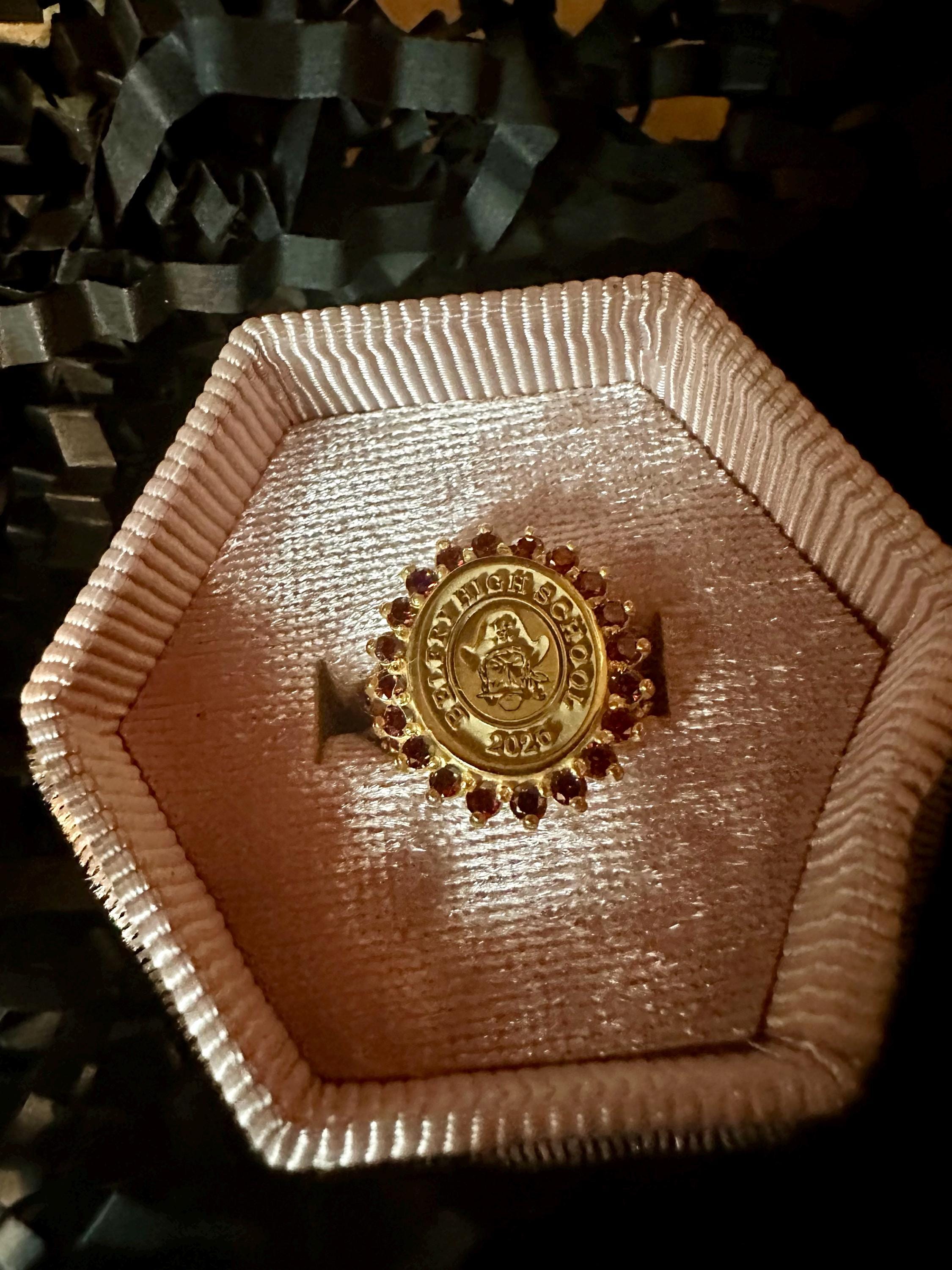 University Class Ring • Ruby Halo, Crest, Personalized Graduation Gift