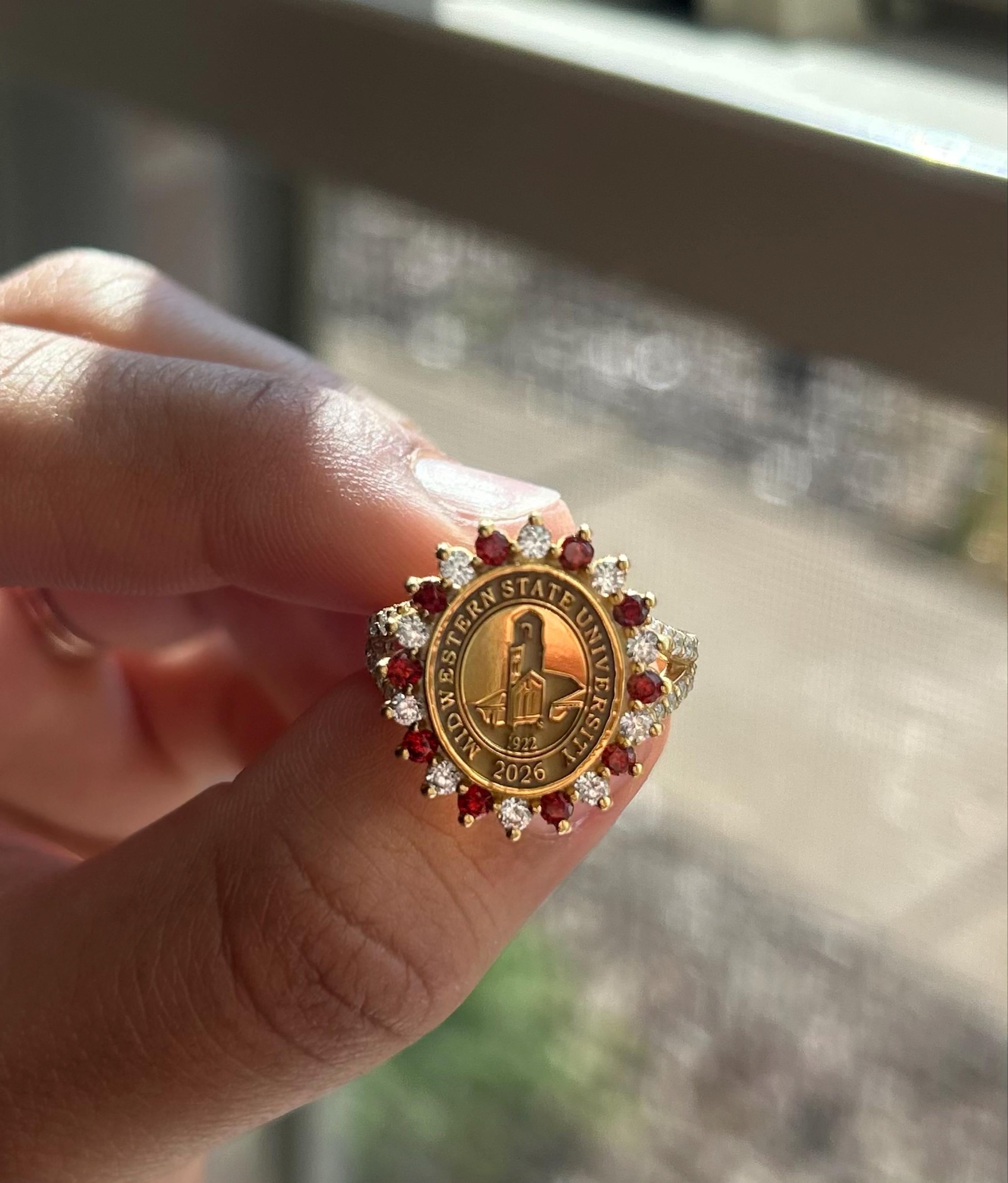 Honor your academic journey with timeless elegance. This 2025 Graduation Crest Ring features a precision-engraved academic seal, surrounded by radiant lab-grown rubies. A split-shank band adds balance and sophistication—making this ring a powerful symbol of achievement, pride, and legacy.