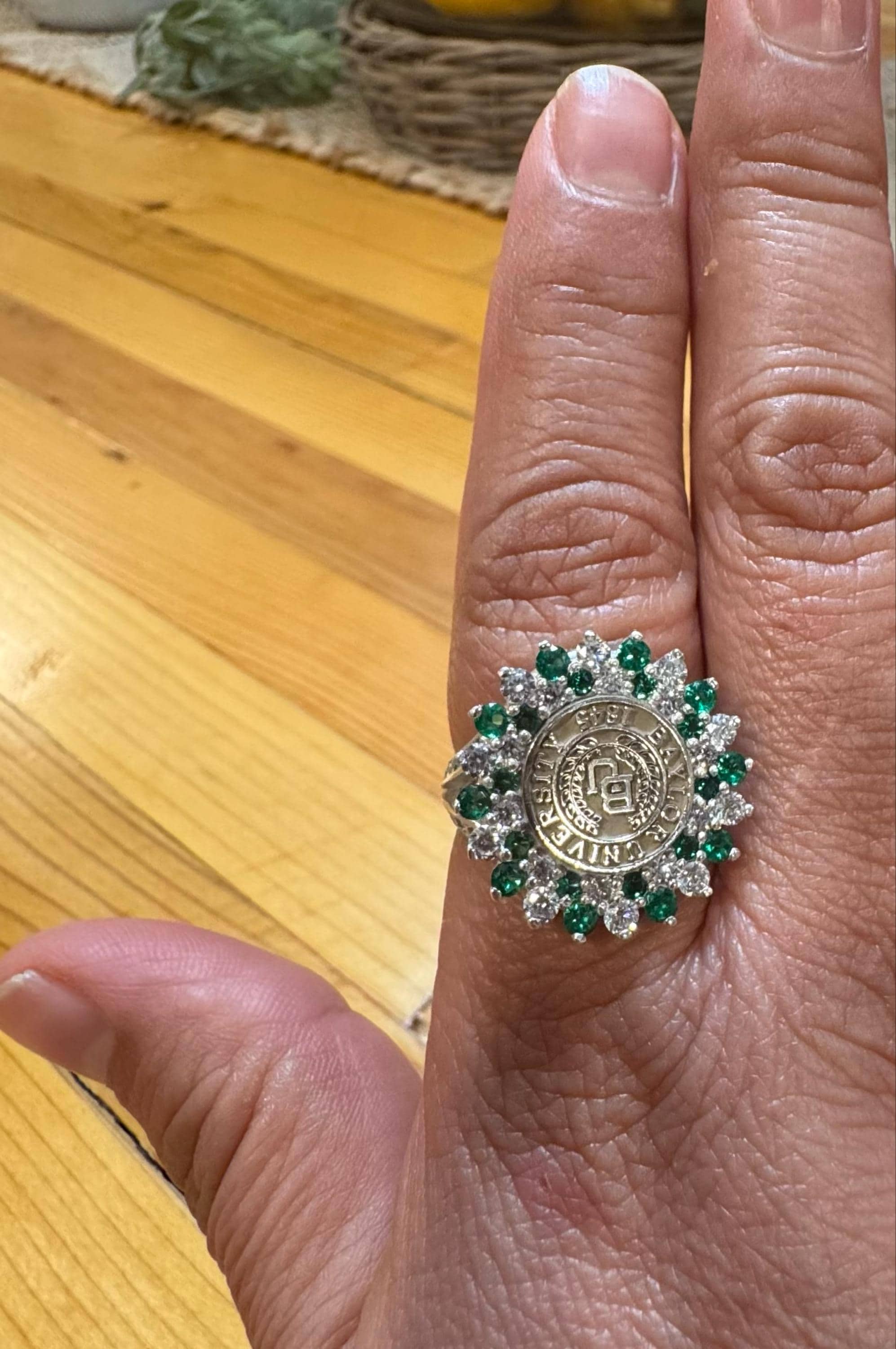 🎓 Celebrate academic achievement with this beautifully handcrafted class ring. Featuring a double halo of emerald‑green and white stones around a finely engraved medical symbol, this piece combines elegance with personal meaning.