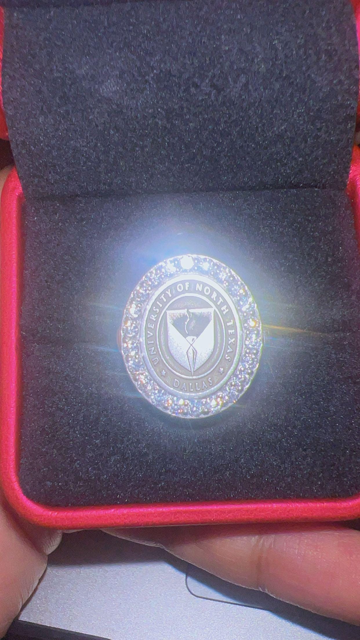 With its emblem-inspired center and sparkling halo, it’s a powerful piece for graduates, professionals, and anyone celebrating a major chapter.